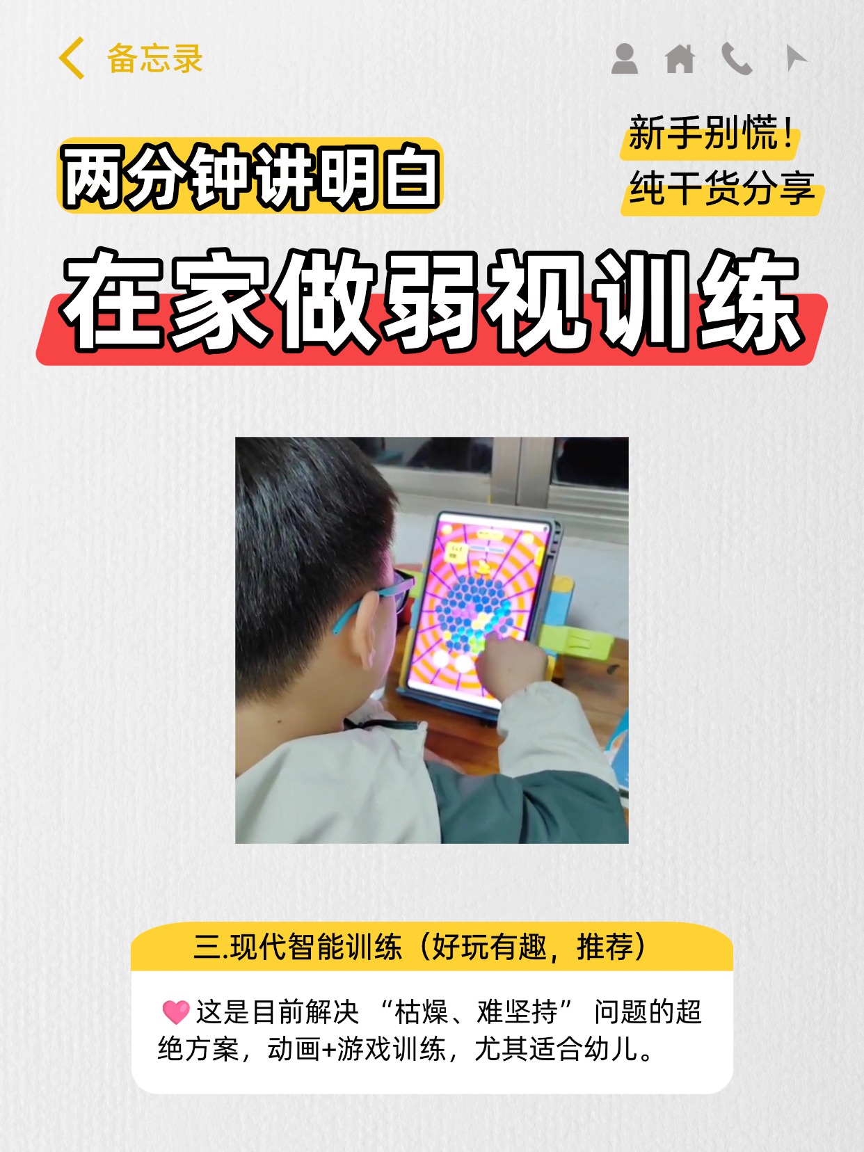 家庭训练中:“坚持配镜与遮盖 + 弱视训练软件(主力) + 传统/生活化训练(辅助)”在家就可以帮助小朋友改善弱视,不用再辛苦跑训练机构了。