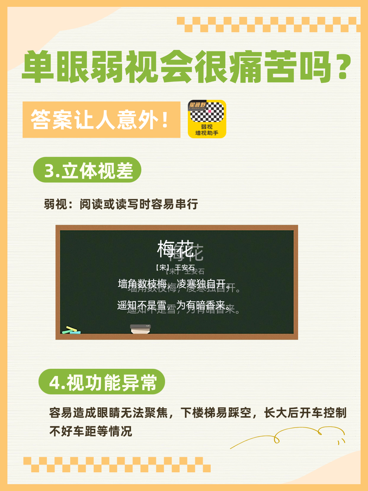 一般弱视伴随视功能缺失,同时视,融合视,立体视不好,容易造成眼睛无法聚焦,下楼梯易踩空,长大后开车控制不好车距等情况