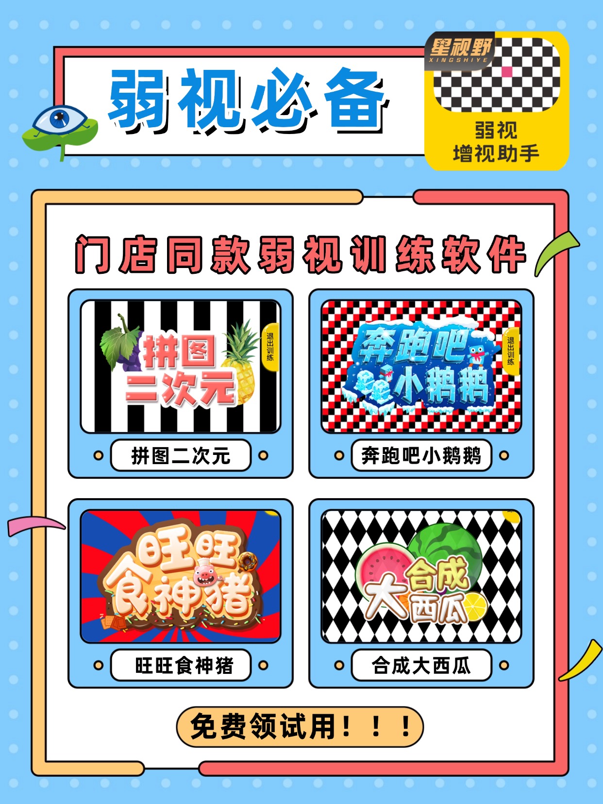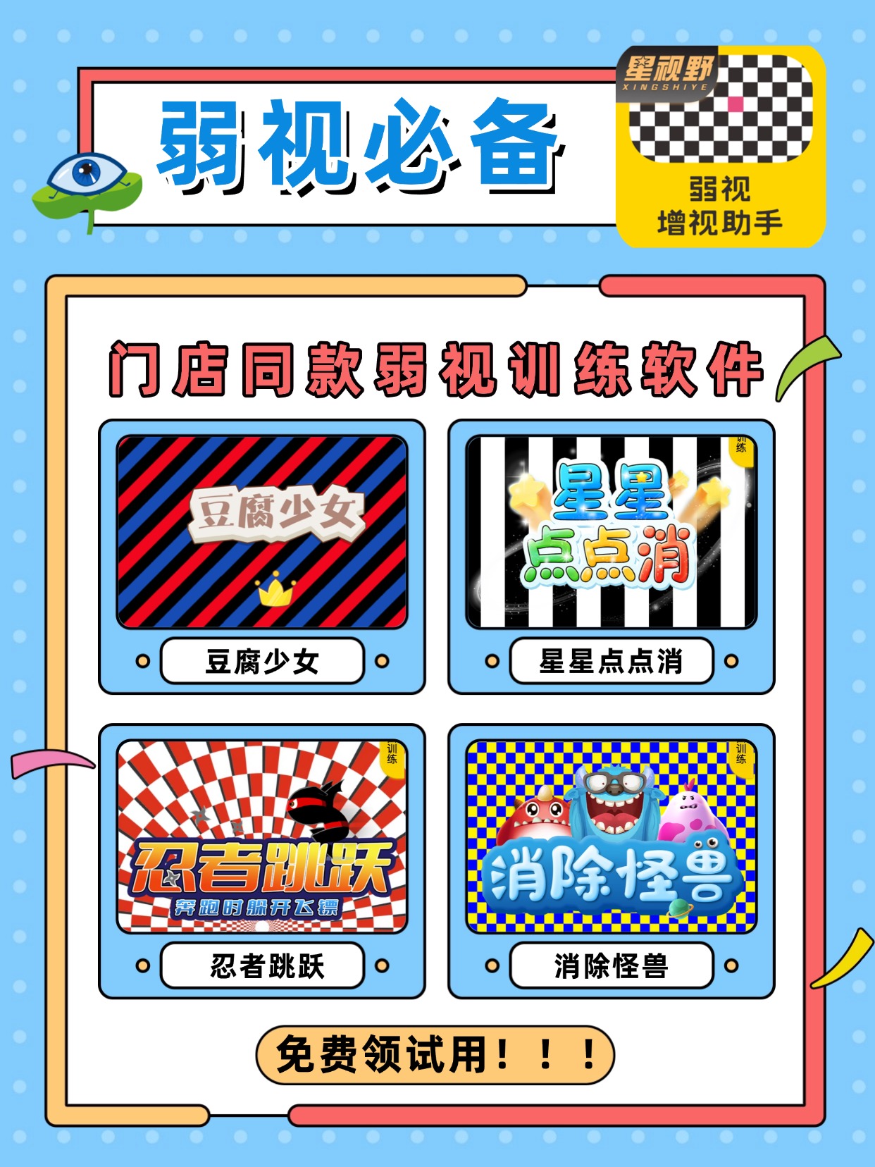 星视野门店同款的弱视训练软件,现在开放免费试用!让你在家就能体验门店同款训练软件。