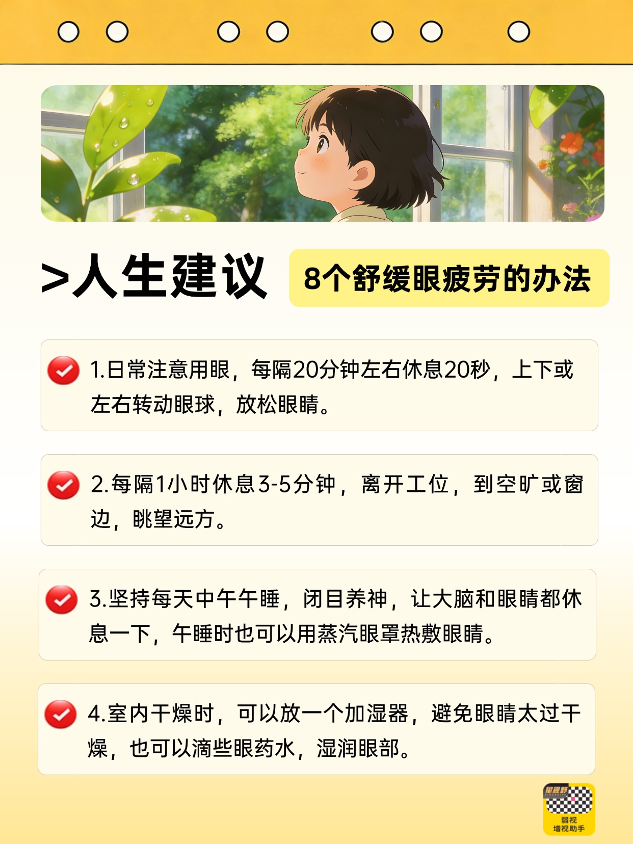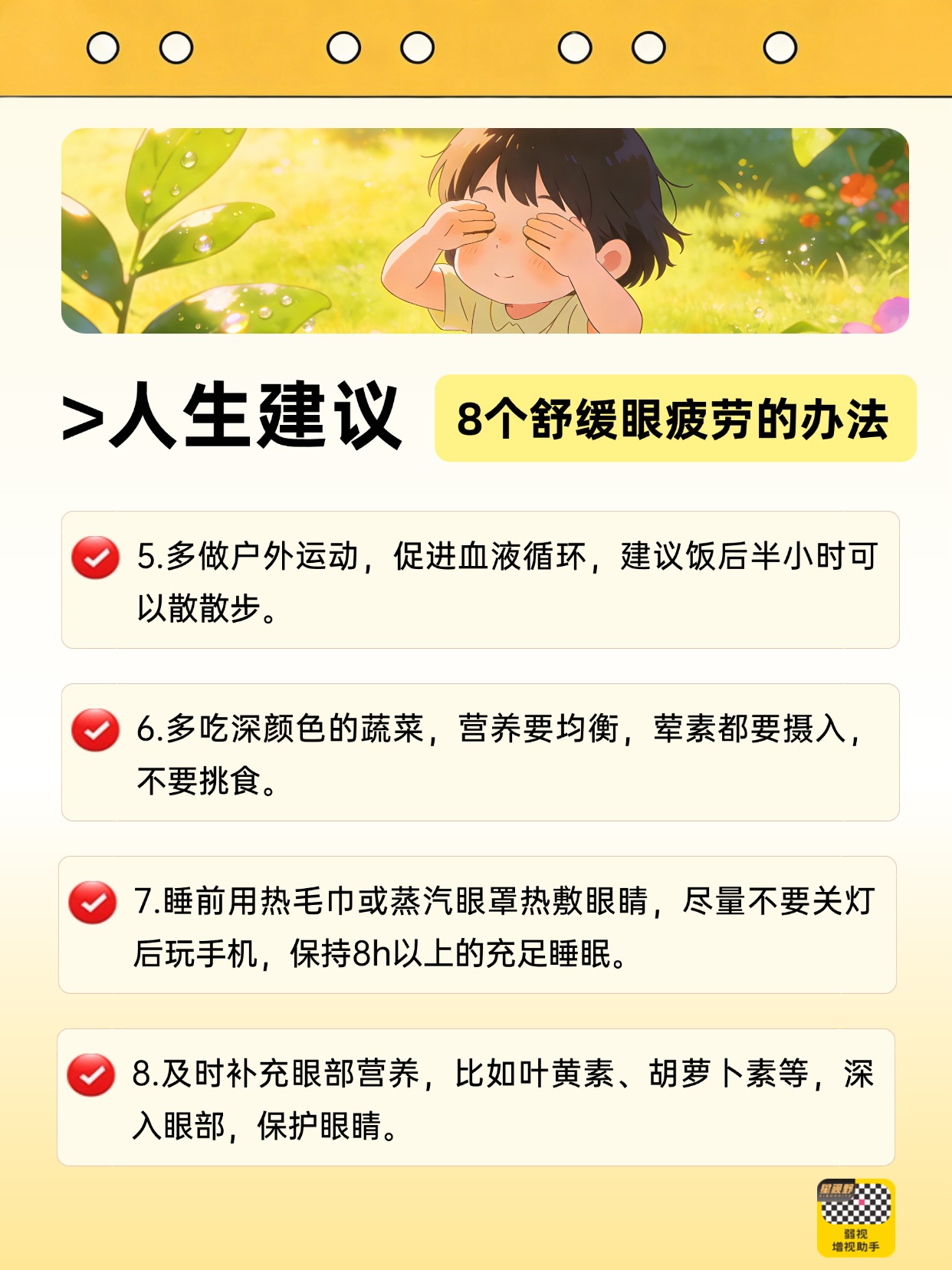 ③.坚持每天中午午睡,闭目养神,让大脑和眼睛都休息一下,午睡时也可以用蒸汽眼罩热敷眼睛。